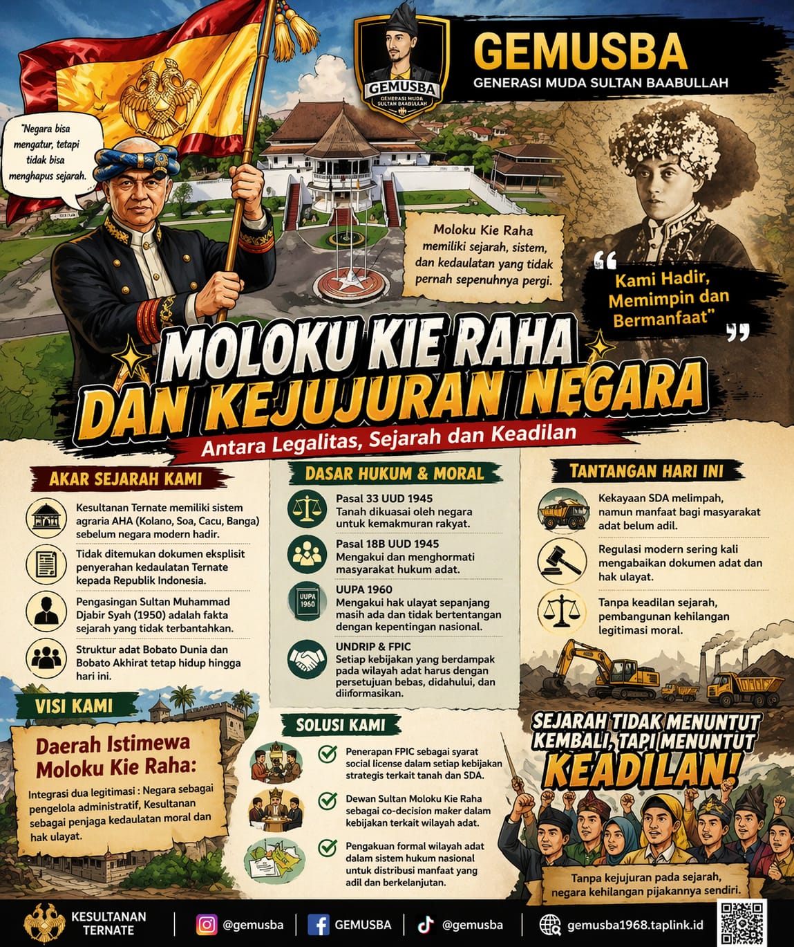 Maluku Utara, Baperone — Wacana tentang Moloku Kie Raha kembali mengguncang ruang publik. Generasi Muda Sultan Baabullah (GEMUSBA) secara terbuka menyoroti relasi antara negara, sejarah, dan keadilan yang dinilai belum sepenuhnya jujur dalam fondasi kebangsaan.
